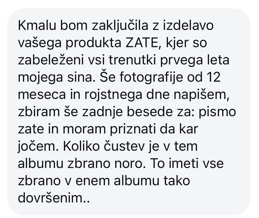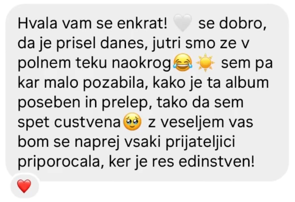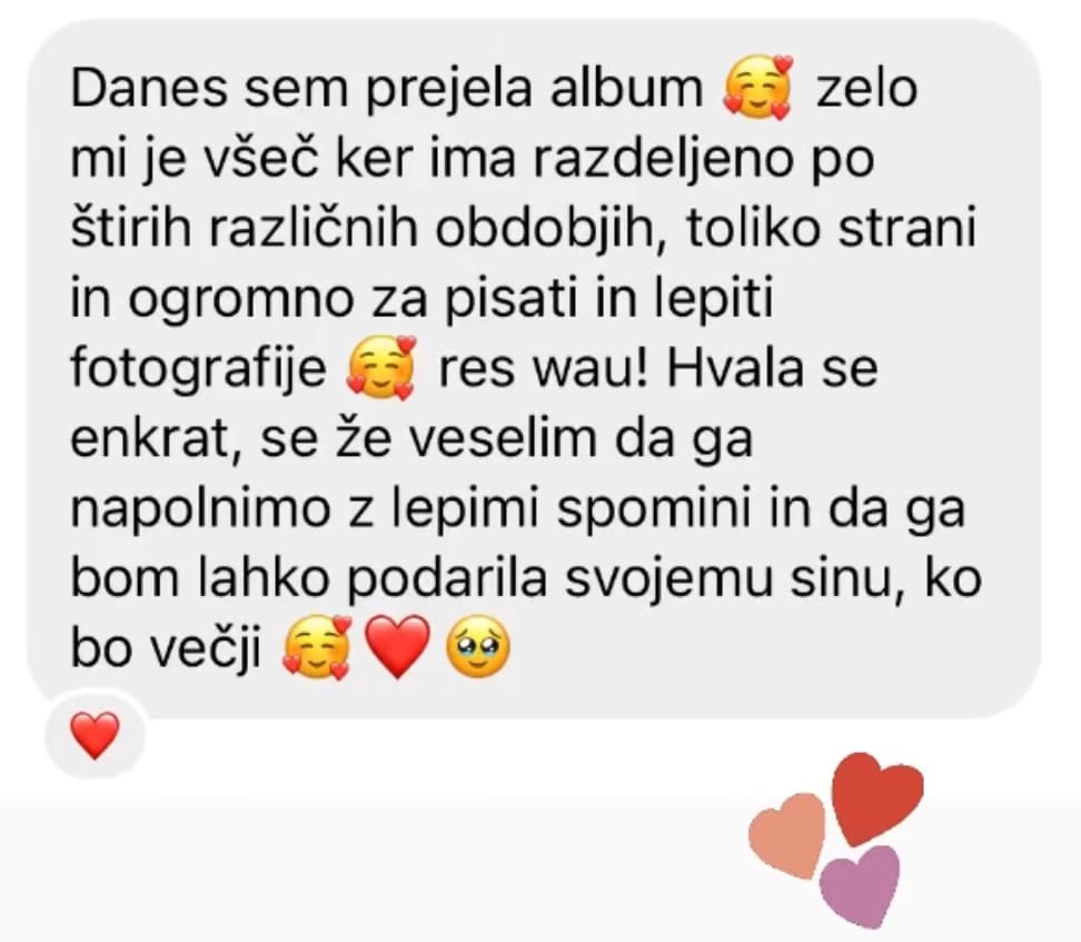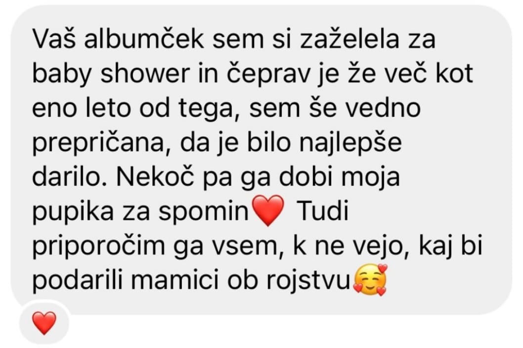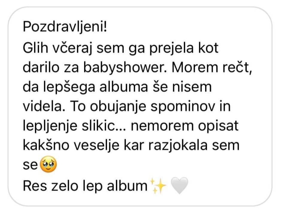 Ni besed, da prehvalim album. Včeraj smo prišli iz porodnišnice in nas je doma pričakal album, ki mi ga je naročila sestra…. wau … Zunanjost, material tak, da ga skoraj ne upam prijet. Vsebina notri pa tako lepo popelje do dojenčka s spoznavanjem para… Odlično! To da sem jokala zraven, ko sem samo pogledala, kaj bom šele, ko bom izpolnjevala pa verjetno ne rabim povedati.